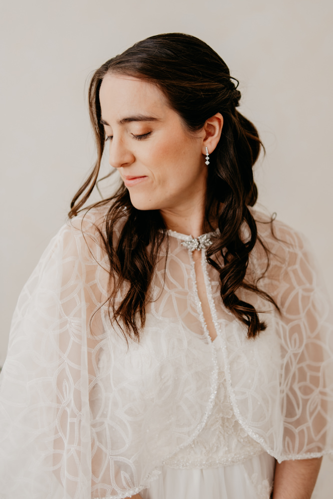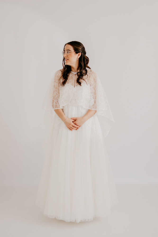 -Dress:Princess cut, elegant drape, and hand-embroidered bodice details. The cape carried the train so she could dance without it.