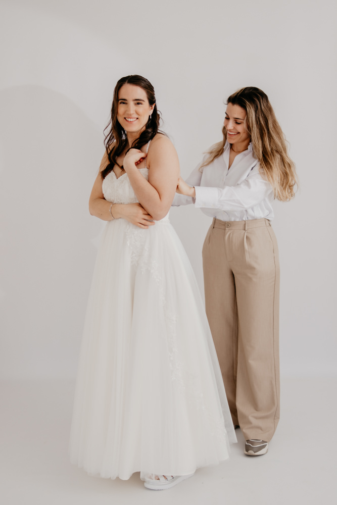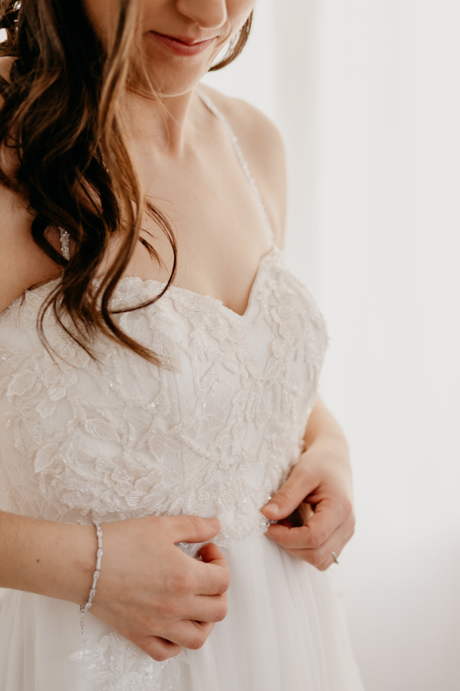 -Finishes:Haute couture. Tulle for the stunning skirt with natural flow. Bridal buttons down the back.