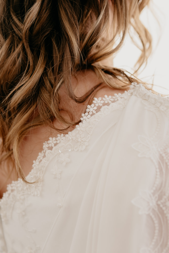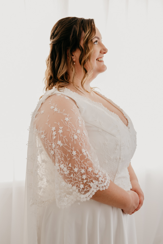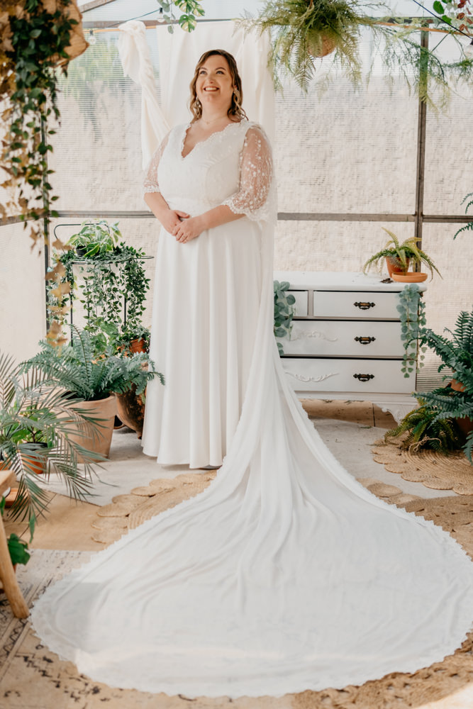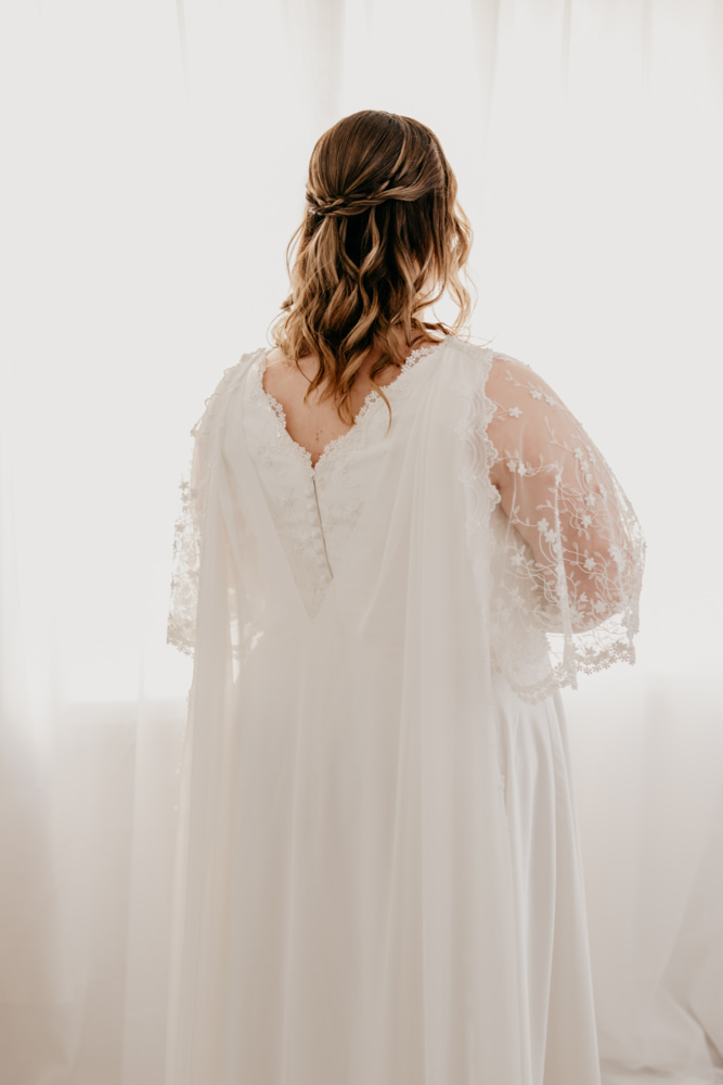 -Tejido:De encaje, crepé y gasa para la capa. Capa extraíble con mucha cola para poder estar cómoda en la fiesta posterior.
