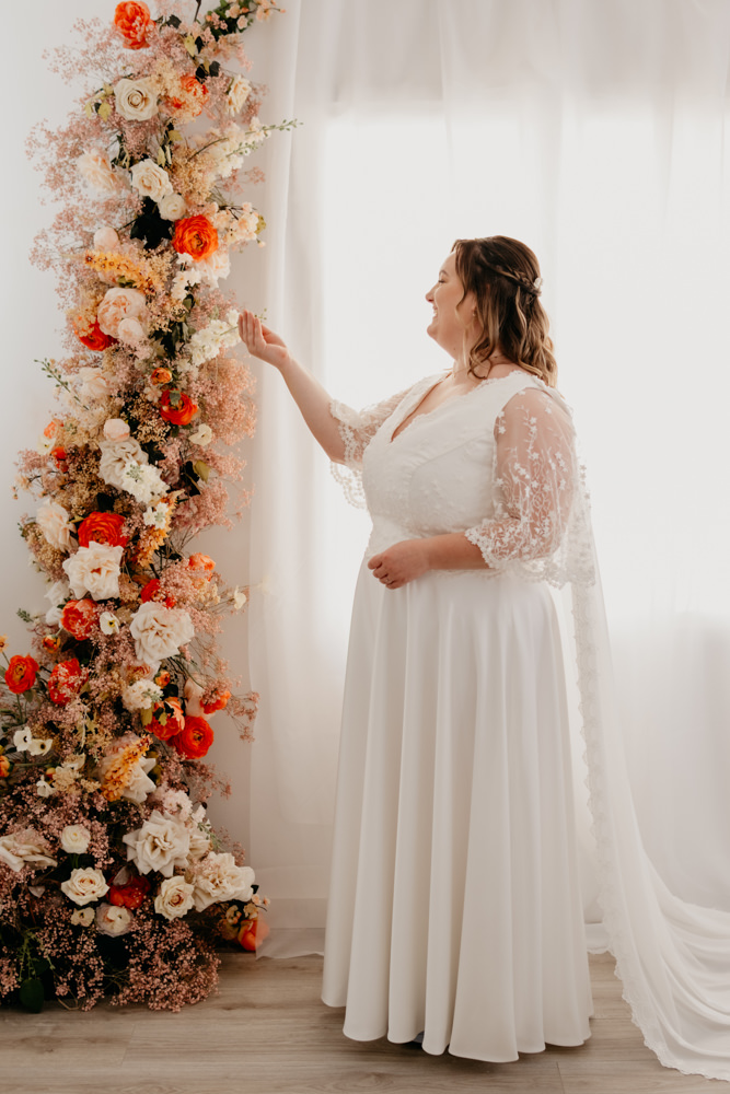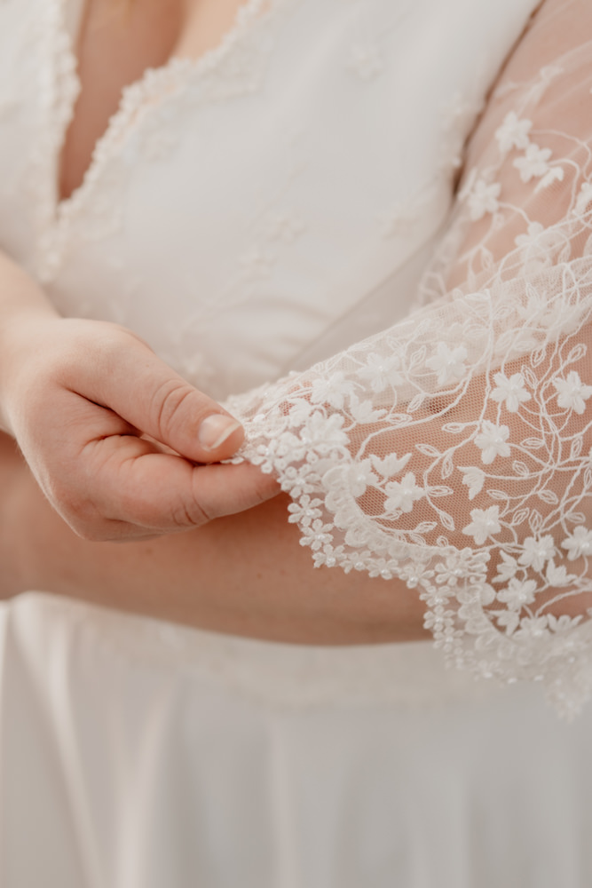-Vestido:De novia hecho a medida y único. Mangas que dan mucho juego, con vuelo y transparentes, ideales para la comodidad y la practicidad.